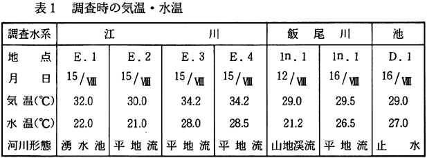 3.調査結果と考察 調査時に測定した気温・水温を表1に示した。