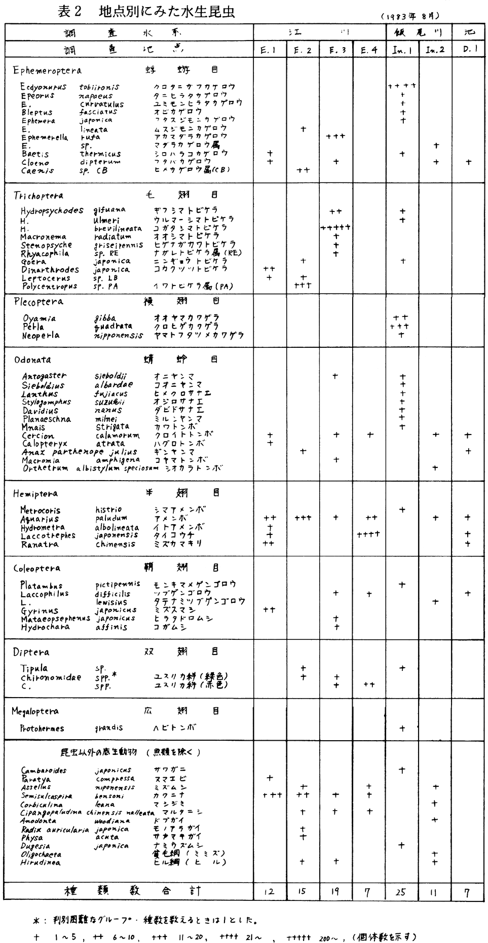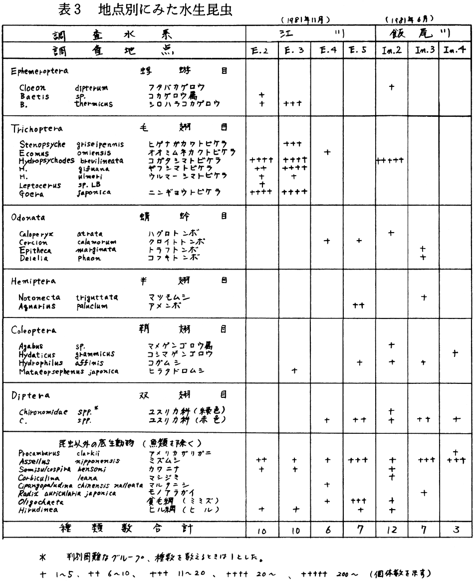 表中の調査地点E.2、E.3、E.4、In.2は図1に示したE.2、E.3、E.4、In.2と同一地点である。E.5(名西郡石井町西高原)は、江川が吉野川に流入する地点である。汚濁が見られ、黒色の砂泥が沈積する。In.3(石井町高川原南島)、In.4(徳島市国府町東黒田)は、いずれも平地のゆるやかな流れである。石礫は少なく、昆虫類はごく限られた種が生息すると思われる所である。 全地点で6目22種の水生昆虫と、その他の底生動物8種を採集した。In.2、E.2、E.3ではコガタシマトビケラの個体数が非常に多く見られたが、今回はIn.2、E.2から姿を消し、E.3ではさらに多くなっている。 下流域のE.4、E.5、In.3、In.4で採集された底生動物は、β〜α中腐水性、強腐水性の指標生物で占められている。生物相からみて、これらの水域が、汚濁のすすんだ水域であることが示されている。