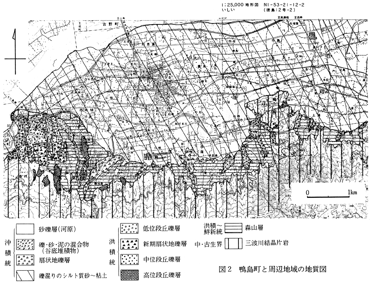 I はじめに 鴨島町は吉野川平野の南縁に位置しており、町内の平地〜山麓地には、第三〜第四紀の吉野川の堆積物が分布している(図1)。
