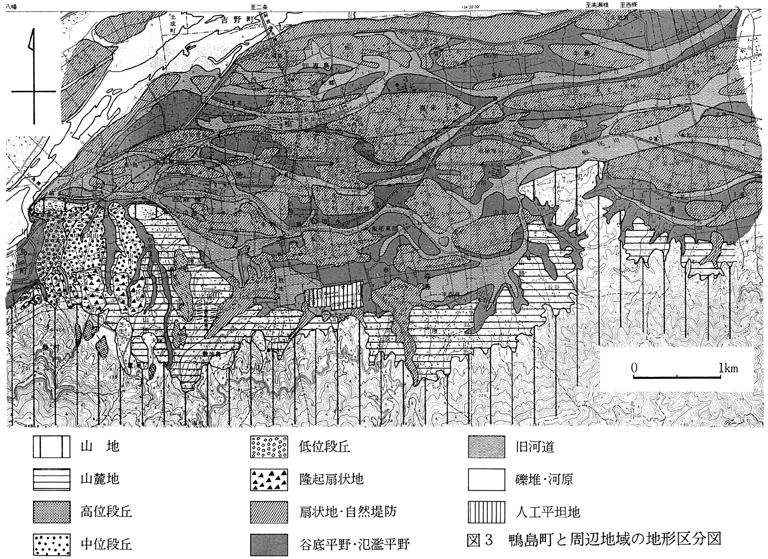 III 地 形 山地:町内南縁部および向麻山、笠松神社付近で、三波川結晶片岩が分布する。 山麓地:町内南部および西部の壇ノ原付近で、森山層が分布する。 高位段丘:海抜65〜100mに断片的な緩斜面として見られ、前述の礫層より成る。かなり開析が進んでいる。 中位段丘・隆起扇状地:森山層の上に重なるこれらの礫層は複合して川島丘陵を形成する。 扇状地・自然堤防:町内の平地のうちで、古くから集落のある喜来、北須賀、蛭子、中須賀、宮間、麻植塚、中島、山路、飯尾、中筋などの地域は比高2m程度の自然堤防である。 旧河道:新開地〜江川、麻名用水〜飯尾川、敷地〜森藤の3地帯を中心に、自然堤防の間をぬって網状に旧河道が発達する。谷底平野より1〜2m低い。