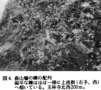 II 町内と周辺地域の第三〜第四紀層 町内ならびに隣接する川島丘陵に分布する地層は表1のように区分される。 これらの地層のうち、鴨島町内には三波川結晶片岩、森山層、高位段丘礫層、沖積層が分布する。 三波川結晶片岩:町内南縁部の山地と向麻山、笠松神社付近に分布する。緑色片岩、黒色片岩、点紋片岩等より成る。 森山層:町内南部の山路・寺谷地域と南西部の敷地・壇ノ原地域〜川島高校東の谷までの70m以下の山麓に分布する。下部の粘土層(森山粘土層)と上部の礫層から成る。森山粘土層は亜炭を伴う湖成堆積物であり、吉野川の後背に堆積したものと考えられる。この粘土層からはトウヒ、バラモミ、モミ、シラビソ、ツガなどの花粉を産し、当時やや寒冷な気候であったと考えられる。礫層の上部は風化が著しく、緑色片岩や砂岩の礫は黄褐色のくされ礫となっている。向原の玉林寺北西200mの地点では、礫の配列は西から東への流れを示す(図4)。