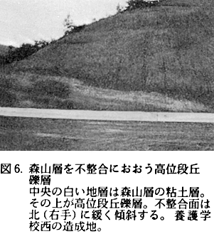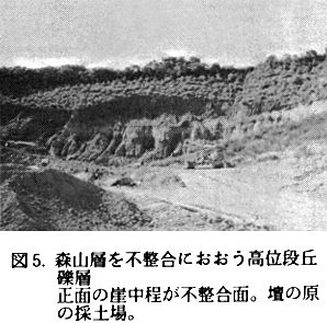 また壇ノ原の土採場では結晶片岩礫に伴って砂岩礫を産することから、これらの礫は南の山地からではなく、吉野川の本流によって運ばれてきたものと考えられる。 高位段丘礫層:町内西部の敷地奥、壇ノ原付近〜川島丘陵の海抜65〜100mに分布する。厚さ約20mで森山層を不整合におおう(図5、6)。礫は結晶片岩類と砂岩の亜円〜円礫より成り、基質は砂質である。基質のみならず礫も内部まで著しく風化しており、赤褐色を示す。