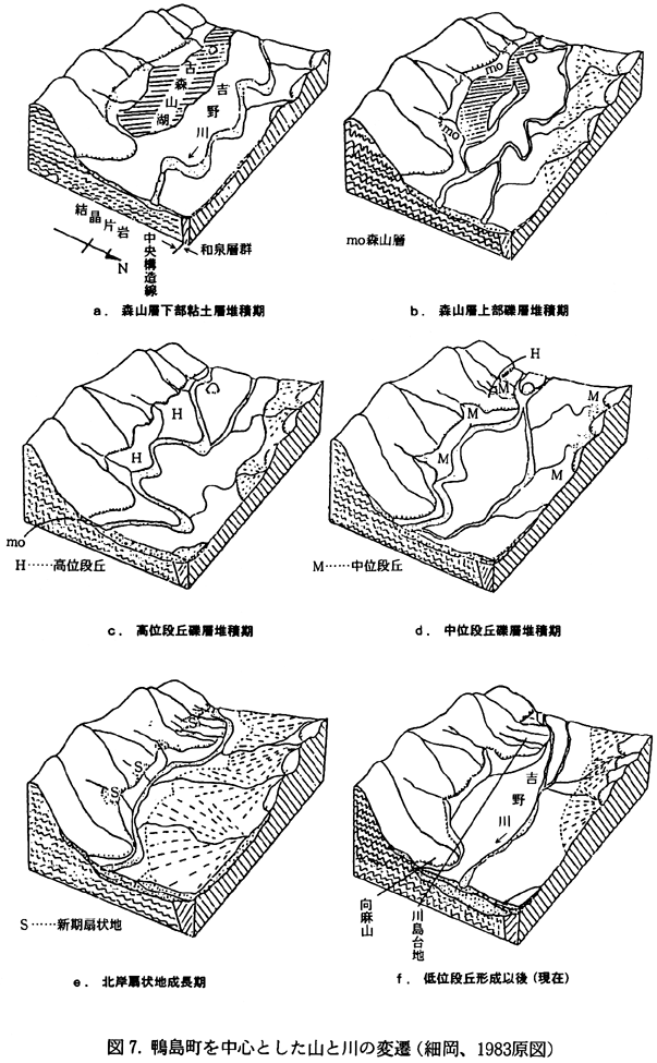 森山層下部粘土層堆積期(図7−a):吉野川谷の沈降にともない、町内南部には古森山湖が形成された。 森山層上部礫層堆積期(図7−b):吉野川の乱流により、古森山湖には和泉砂岩礫を含む礫層およびシルト層が堆積した。 高位段丘〜中位段丘形成期(図7−c・d):森山層の堆積後、吉野川の乱流と海水面の変動により高位段丘と中位段丘が形成された。 北岸扇状地成長期(図7−e):阿讃山脈の上昇により北岸に扇状地が発達し、吉野川は南岸を侵食した。固い基盤岩の露出する向麻山や笠松神社付近は侵食をまぬがれ、川島丘陵が形成された。 低位段丘形成期以後(図7−f):川島丘陵の形成とともに吉野川の流路は町内中央部から北部(笠松神社−向麻山以北)へと移り、縄紋以降は江川の流路を経て現在に至った。