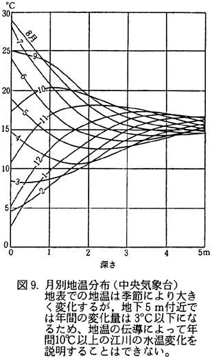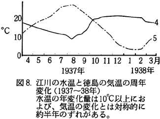 V 江川の水温と水源について 江川の水温は夏に冷たく冬に温かいことで知られている。1937〜38年の調査によれば、図8のように8月には10℃以下、1〜2月には約20℃であり、気温の周年変化と半年ずれている。