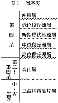 今回はこれらの地層の調査を行った(表1、図2参照)。また航空写真と地形図をもとに町内と周辺地域の地形区分を行った(図3)。さらにこれらをもとにして町内の山と川の変遷(地形発達)について考察した(図7)。なお江川の水温変化について若干の考察を行った。