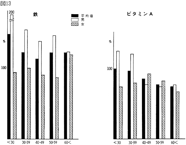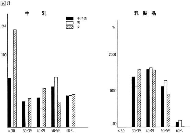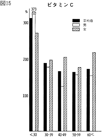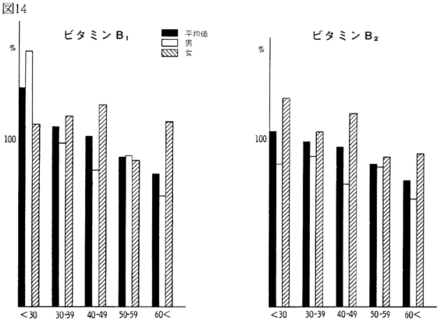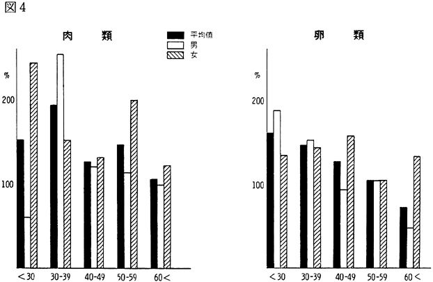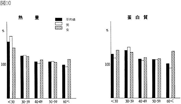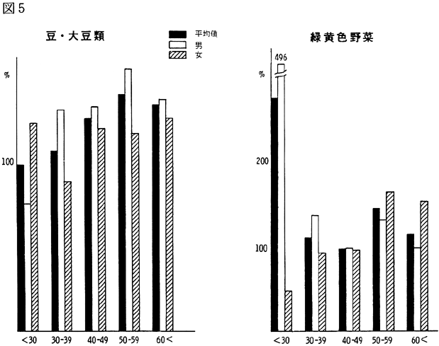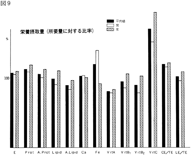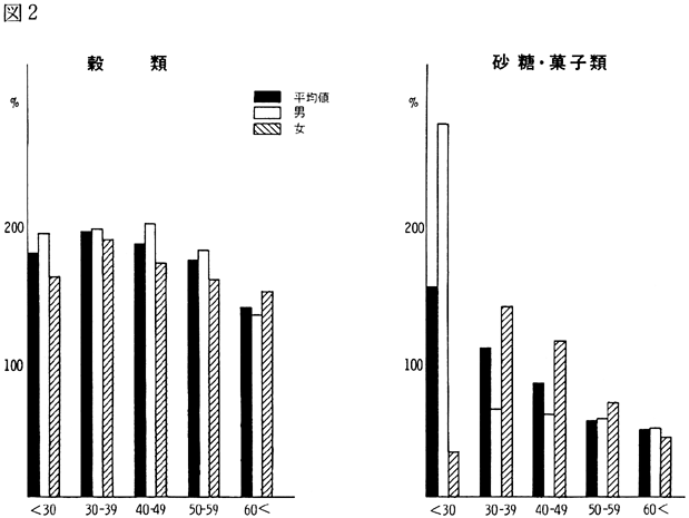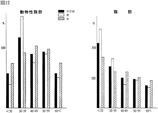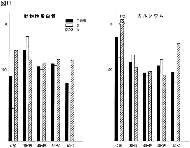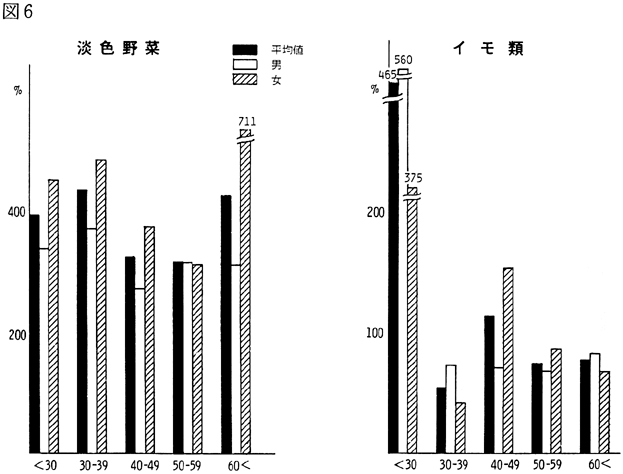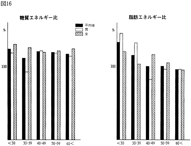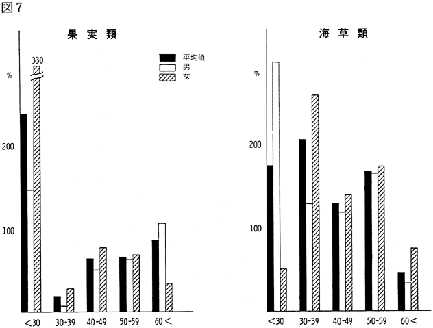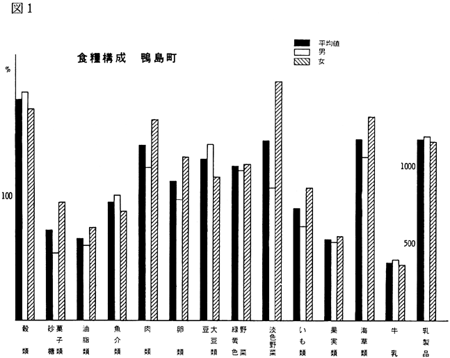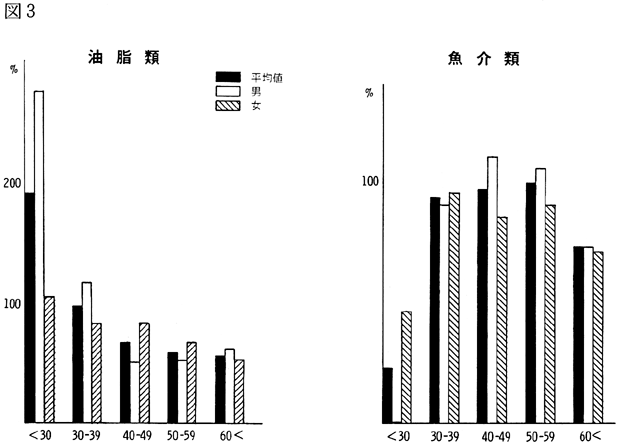 〈調査結果および考察〉 1)鴨島町住民の食品群別摂取量を性、年令、身長、体重、労作強度を考慮し、食糧構成基準を100%として比較すると(図1)、穀類は男、女とも高く、蛋白質食品では肉類・豆・大豆類が高く、魚介類はやや低いが卵類はほぼ基準値を充たした。油脂類、いも類、菓子類は低いが、盛夏の調査であり、嗜好面の影響が大きいものと考えられる。緑黄色野菜、淡色野菜の摂取は高く、特に、淡色野菜はその内訳のほとんどが西瓜によるものであり、このことは果実摂取に影響を及ぼし、摂取を低くしたと思われる。海草類(特にワカメ)の摂取が高いのは、これまでの他の地域と同様であり、徳島県の食物摂取の特徴と考えられる。これは、ワカメの保存性、ワカメに対する嗜好、食習慣等が、魚介類とちがって地理的な制約を受けにくいためであろうと考えられる。 2)年令別にみた食品群別摂取量 図2〜図8は性別、年令別に各食品群の摂取量を1)と同様に食糧構成基準を100%として比較したものである。なお、この図において20才代の対象者が少ないため考察から除去した。穀類は各年令層で高く、男女の差は少なく、砂糖・菓子類は全般的に低いが、女性にやや高い傾向がみられた。摂取量の低かった油脂等は全年令で低く、夏期の影響と思われる。魚介類は全体的にはやや低いが、40才代、50才代にその傾向が強い。逆に、肉類の摂取量は全般的に高く、30才代にその傾向が強い。卵類はほぼ基準摂取量であるが年令が高くなるにつれて摂取量が低くなる傾向がみられた。豆・大豆類は全般的に年令と共に摂取量が高くなる傾向にあった。緑黄色野菜は各年令層でほぼ基準値を示し、淡色野菜は全般に高く前述した夏期の影響と考えられる。イモ類・菓子類は全般的に低く、海草類は各年令層で比較的高く、特に30才代の女性に著名であった。牛乳は全世代を通じて低く、逆に、乳製品が非常に高いのは調査期間が夏であり、アイスクリームなどの摂取が増加しているためであろう。 3)栄養摂取量 図9は各種栄養摂取量を農耕従事者一日あたりの栄養所要量に対する比率としてあらわしたものである。摂取エネルギーは、所要量をほぼ充たしているが、生活時間調査で得られた消費エネルギーと比べると、前回と同様に、男性で0.92、女性で0.91と消費エネルギーが摂取エネルギーを上回っていた(表1)。 蛋白質は動物性蛋白質とも所要量を充たし、脂肪は動物性脂肪とともに所要量を下回った。カルシウム、鉄もほぼ所要量を充たしたが、鉄は女性でやや低い傾向がみられた。ビタミンA、B1、B2は所要量より低くビタミンCは所要量をかなり上回った。 総摂取エネルギーに対する糖質エネルギー比は所要量に比べやや高いが、男女差は少なく、また、脂肪エネルギーもほぼ所要量に近い。 4)年令別にみた栄養摂取量 次に、年令別にその栄養摂取量をみたが(図10〜16)、熱量、蛋白質では年令差は少ないが、動物性蛋白質では60才代においてやや低い傾向を示した。カルシウムは各年令を通じて所要量を充たしているが、ワカメのほかに牛乳などカルシウム供給源の摂取が習慣化すれば、動物性蛋白質や他の栄養素の補充に伴って栄養状態、健康状態がさらによくなり、今後ともさらに取り組みたい問題であろう。脂肪とくに動物性脂肪は所要量をやや下回り、年令とともに低くなる傾向にあった。 鉄は各年令を通じ女性に少なく、ビタミンA、B1、B2も各年令層で所要量より少ない。 ビタミンCは各年令を通じ所要量を充足した。糖質エネルギー比は各年令層で等しく高く、脂肪エネルギー比もほぼ所要量に近く、年令層、男女間の差はほとんどみられなかった。 みそ汁の塩分濃度の度数分布(図17)をみると、1.2%をピークとしてかなりの人が1%の標準濃度を越えており、全般的に高い塩分濃度のみそ汁をとる人が多かった。みそ汁の摂取頻度やみそ汁以外の漬物、しょうゆなどの摂取を考えると、塩分摂取過剰に気をつける必要があろう。