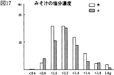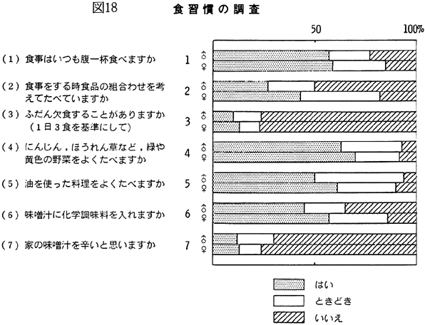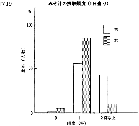 〈食習慣の調査〉 食習慣の調査についてみると(図18)、男性の場合、あまり食品の組み合わせを考えて食事をしない傾向がみられるのに対し、女性の場合は比較的食品の組み合わせに気を配って食事をしていることがうかがえた。 一方、みそ汁については、女性がほとんど1日1杯しか飲まないのに対し、男性の場合は1日2杯以上の割合が全体の45%と高く、前述の塩分濃度と合わせて考えると、男性の塩分濃度のとりすぎをうかがい知ることができる(図19)。