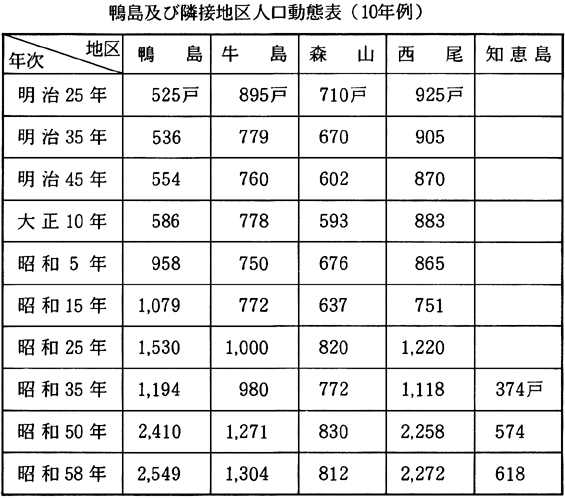 人口動態について: 明治25年以後の戸数の推移を、約10年毎に表に組むと次のようになる。