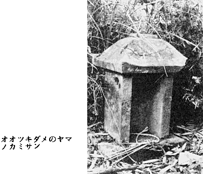 はじめに 山の神はふつう“ヤマノカミサン”と呼ばれる。祭神は一応“大山祇神”とされているが明確ではない。上浦の場合は、山の入口、あるいは中腹に、高さ0.7m〜1.5mの撫養石を使用した祠を持っている場合が多い。(大きな松が何本かある所を山の神さんと呼んでいるものもある。)現在は、氏神である国中八幡神社境内に合祀されているが、祠は殆んど以前の場所に残っている。祭礼は1月9日に行われる。しかし、山の神に関する行事については、だんだん少なくなりつつあるといえるだろう。