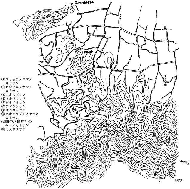 III 山の神信仰について a. 場所について 祠は、山の入口、中腹などにあり、道に背をむけたかっこう(以前は道の正面にあったが、現在は道がかわっている。)あるいは、うっそうと生い茂る林の中など、きわめてわかりにくい場所にある。かつては、どの山の神にも、1反(10アール)ほどの土地があり松・桜・杉・椎などの大木が茂っていたという。この土地も、大正四年の合祀の際に民間に払い下げられたため、現在は特に山の神の木としての大木は存在しない。また、なかには祠がなくなっている所もある。 以下は、山の神の祠を東側から順に記したものである。 1