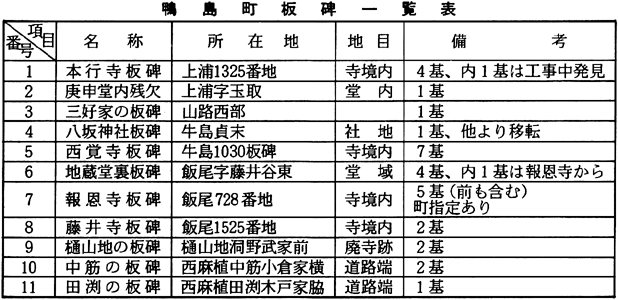 C まとめ 以上鴨島町内の板碑について、紙数の関係もあって簡略化して報告した。「板碑だけでは板碑は分からない」という言葉の通りに、板碑も中世社会の動きの中に位置づけるべきことは言うまでもない。しかし、中世文書等の資料が少なく、その結びつきについての考究が十分でなく研究が進展していない。 従来の板碑研究は銘文・種子が中心であったが、これからは板碑自体の基礎的把握(形態論・材質論・加工論・種子銘文論等)は勿論、地理的環境や歴史的背景から板碑を考える時期に来ていると思われる。そのためには石造美術だけでなく、中世考古学、歴史地理学、民俗学、仏教史等各方面からのアプローチが必要であると思う。各分野の諸先生方にご指導をお願い申し上げると共に、鴨島町内の板碑所有者の方々に厚くお礼申し上げます。 鴨島町板碑関係文献目録 ○服部清五郎『板碑概説』昭和8年 ○鴨島町教委『鴨島町誌』昭和39年3月 ○徳島委『石造文化財』昭和52年3月 ○三宅武夫『石造美術』(写真入り手書稿本) (この項森本)