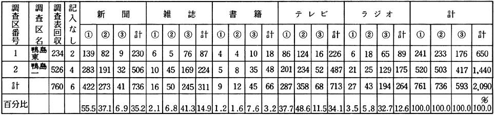 のみの計 新聞 55.5% テレビ 37.7% ラジオ 3.5% 雑誌 2.1% 書籍 1.2% 計 100.0% 電気媒体と活字媒体がおよそ50対50であるが、新聞が大きいウエイトを占めていることが分かる。 3.県立図書館の利用状況 県立図書館の利用体験は35%の住民であり、その利用状況はつぎのようになる。 図書の借用 15.7% 巡回図書の利用 8.2% 図書の閲覧 5.9% 参考奉仕(口頭) 1.5% 〃 (電話) 0.4% 読書会に参加 0.8% 読書グループ所属 0.6% その他 1.9% 計 35.0% 4.最近の読書状況 最近の3か月間に、本を読んでいるか、という調査であるが、次のとおり。 雑誌 24.7% 週刊誌 24.1% 書籍 22.4% 読んでない 28.8% 計 100.0% 以上のようになり、比較的、手軽いものを読んでいる。70%の住民が、何かを手にしていることになる。 5.読書の動機 読書の動機については、それぞれ、 書店・駅の売店 27.5% 新聞広告 17.3% 新聞雑誌の書評 15.5% 人にすすめられて 6.9% テレビを見て 6.3% 雑誌広告 5.6% 図書館・公民館 3.2% ポスター 2.7% 寄贈 2.5% ダイレクトメール 2.3% ラジオ 2.2% 映画 2.0% カタログ 2.0% その他 4.0% 計 100.0% 以上の結果が出ている。一応、書店・売店で手にとって確かめてから、というのが、他に比して随分多いようである。 6.読書の目的 娯楽のため 24.8% 趣味のため 24.2% 教養のため 14.5% こどもの教育のため 12.1% 職業上の必要から 11.8% なんとなく 11.5% その他 1.1% 計 100.0% であり、およそ50%の人が、目的に功利性がなく、楽しみに読書をしている、ということができる。 7.読書する本を入手する方法 自分で買う 63.9% 友人から借りる 14.3% 家にある 5.6% 図書館・公民館 5.5% 学校から借りる 3.1% 職場文庫から借用 2.6% 貸し本屋から借りる 2.0% 移動図書館車を利用 1.8% その他 1.2% 計 100.0% 8.図書館の蔵書充実の希望 15項目に分けて、希望(要求)を追跡してみたが、10%以上のものは、 文学関係 15.0% 歴史地理関係 12.8% スポーツ娯楽関係 12.4% 健康保健関係 10.0% 等となる。その他各項目に散らばって希望がみられる。希望が多様化しており、技術革新の社会性に即応しているとも考えられる。図書館では、各方面にわたって充実を計っている。 9.余暇の利用 ラジオ・テレビ 40.5% 読書 16.5% ごろ寝・休息 13.8% 買物 13.7% スポーツ 7.6% 日帰り旅行 2.2% 一泊以上旅行 0.7% その他 5.0% 計 100.0% 以上となる。読書が第2位で、余暇利用が次第に多面的なひろがりを見せ始めていることが明らか。 10.図書館等の建設・整備・充実について 日常どのように考えているかを、全くアトランダムに記入していただいた。50件の記入が見られた。 公民館整備 16% 図書館建設 10% 巡回図書 14% その他 60% の希望があった。その他60%のなかには、図書館が余りにも身近にないとか、広報関係が徹底していないとか、日曜・夜間の利用その他で、わからないというものなどであった。