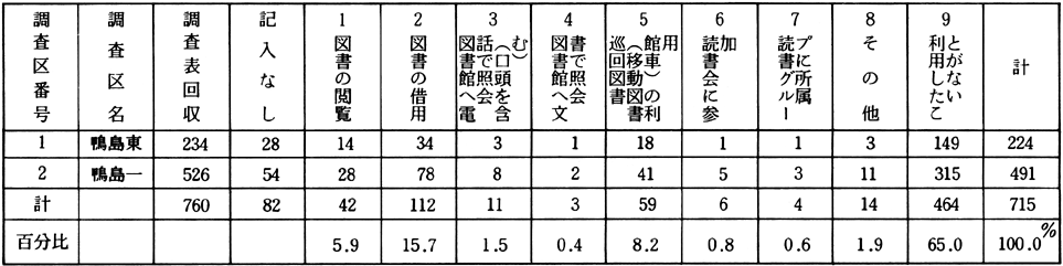 〈むすび〉 図書館は、いつでも、どこでも、誰にでも利用できるという、身近な暮しに定着したものでなければならないことを、この結果からも痛感できた。鴨島町にも、ふさわしい図書館が必要ではないかと思う次第である。