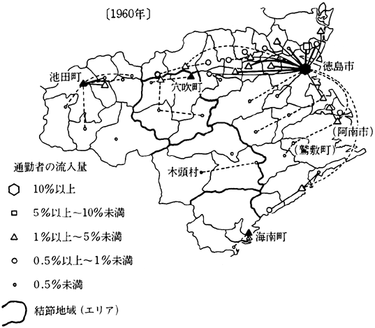 60年においては、徳島市・池田町・穴吹町・海南町・木頭村の5市町村を頂点(最終結節点)とする5つの結節地域(エリア)が存在した。しかしながら、10%以上の指向率を有していたのは徳島市のみで、それも吉野川中下流域に隣接する町村からに限られたものであった。この他の結節地域においては、いずれも各市町村間の結節力は弱く、県西・県南地域のほとんどの市町村では、農林業などの第1次産業を中心とした就業構造の下に、自市町村内就業率は極めて高かったといえる。鷲敷町においても、1960年の町内就業率は88.6%(県平均89.3%)を示していた。 80年になると、徳島県の通勤者総数は78,277人となり、60年時点の43,491人