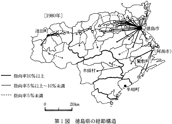 な反復運動とみなすことができる。そして、各市町村間の通勤者数を分析指標とした通勤流の検討は、各市町村間の結節関係、あるいは地域的な特徴を導き出すのに便宜的である。ここでは藤巻の方法に従って、1960年と1980年の時点での結節構造を検討したい(第1図)。