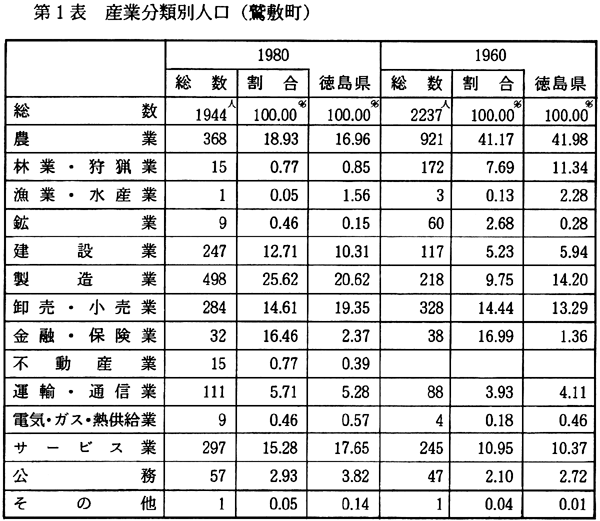 (I)人口 鷲敷町は古くより、藩政時代に丹生谷58か村組頭の所在地であった和食と、町筋で在町的機能を有した土佐町を中心に、丹生谷の谷口集落として発展してきた町である。現在でも、第1表にあるように、金融・保険業就業者数の占める割合が極めて高いことは、そうした中心性の一面を表わしていよう。 しかしながら、戦後の高度経済成長下において、道路網の整備やモータリゼーション化の進展とともに、鷲敷町でも農林業の相対的な地位低下がみられ、結果、人口流出という我が国山間町村に共通する現象を呈してきた。 こうした変化は、鷲敷町住民の就業構造のあり方に影響を及ぼしたことは言うまでもない。第1表は、1960年と1980年とにおける産業分類別人口(常住地就業者)の比較である。