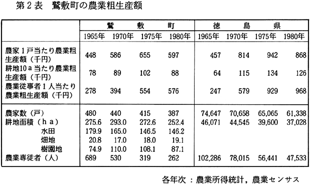 (II)農業 (1)農業基艦とその変化 鷲敷町は、那賀川中流域の傾斜地山原野の占める率が高く、耕地率は8.4の山間地農業地域である。主要耕地は那賀川河谷とその支流谷にある。とくに、中山川・南川が那賀川と合流する地帯にかなりまとまった耕地があり、鷲敷町農業の中心地帯を形成している。 これらの農用地での水田率は57.9%で、那賀川沿いの山地にみごとに開発された棚田が小現模に展開し、鷲敷町農業生産の基盤となっている。しかし、この水田規模は一農家当たり、37.7aで、農家にとっては自給生産の域を脱しきれない状態にある。 この主谷河岸段丘面、支谷河岸段丘面や開析谷低地部に発達した水田を基盤として、換金作物としてタバコ、スダチ、温州ミカン、生食用タケノコをはじめ、食品加工用原料作物の水ブキ、タケノコの生産を補完関係作物として農業経営に導入することで農業収益の高収益化を図ってきた。 鷲敷町は仁宇谷5ケ町村の入口にあたり、第2次大戦前頃までは、那賀奥林業の木材流送の中継地点であった。このため、人の出入りも非常に多く、仁宇谷5ケ町村の各集落と結合した商業機能地域を形成し、地域住民に就業の場、サービスの場を提供してきた。戦後になって那賀川の電源開発が進行するとともに、交通条件の整備がなされ、阿南工業地域との関係が強化された。鷲敷町と阿南工業地域との関係強化は物流の強化と労働力流出の強化とである。とくに、労働力流出の強化は、農林業労働力の流出現象として表面化した。農業労働力の流出は、農家の兼業化を著しく進行させ、在町通勤兼業農家を増大させた。 1980年の専兼業農家数は、総農家数387戸に対し、専業農家41戸(10.6%)、一種兼業農家45戸(11.6%)、二種兼業農家301戸(77.8%)となっている。1956年に比べ農家数は20.0%減少している。専兼業別の変化では、専業、一種兼業農家が減少し、二種兼業農家が増大している。鷲敷町においても、農業経営基盤の弱体化とともに山村農業地域に一船的である二種兼業化が進行し、農業構造再編が強く望まれている。このような状況下にあって、鷲敷町の農業生産の変化に大きい影響を及ぼす事業計画が実施された。1978年から1980年にかけ新農業構造改善事業の一環として、土地基盤整備事業、農業近代化施設整備事業の実施である。 この事業計画は、仁宇地区、八幡原地区にイチゴの集団パイプハウスを設置し、専業農家の育成強化を図るものであった。1978年にイチゴの集団パイプハウスが完成して以来芳玉と宝交の二品種が栽培されている。現在では、、品質の良さが市場で認められ、産地としての評価を高めている。 また水田利用再編対策による転作や農産物輸入自由化により市場性の弱くなった温州ミカンの改植として、スダチの増産が行われるようになった。とくに露地中心の栽培からハウス加温、ハウス無加温栽培の導入が図られるようになり、早期出荷によって安定した収益を得るようになってきた。 以上のように、鷲敷町の農業基盤は、山間地主谷河川の河岸段丘面、支谷河川河谷低地の水田や、山間地傾斜樹園地や竹林における水稲、水ブキ、温州ミカン、タケノコを中心作物としてきた。農工間所得格差の増大が農業経営環境を悪化させる中で、二種兼業化が一般化し、在町通勤兼業農家を増加させた。このような農業の分解過程の中にあって、平担地農業地区では、ハウスイチゴの栽培に取り組み、山間傾斜地農業地区では、スダチ、タケノコの栽培に経営の中心を転換するなど、イチゴ、スダチ、タケノコ、水ブキの特産地農業が展開しつつ、商品生産農業の育成が進行している現状にある。 (2)農業の性格 鷲敷町農業の性格を各種統計によってみると次のようである。1965年の農業粗生産額は215百万円であったが、1980年には472百万円と2.2倍の増加となっている。農業一戸当たりの農業粗生産額は59.7万円で、徳島県平均より低く、農業経営規模の小さいことを示している。土地生産性は8.8万円で徳島平均の12.6万円の69.9%となって、県平均より低い。労働生産性は57.6万円で、徳島県平均の96.8万円の59.5%となって顕著に低い。このように土地生産性の低さが、山間地農業地域にあたる鷲敷町農業の性格を示すとともに、一農家当たりの生産規模の零細性を表している。(第2表)