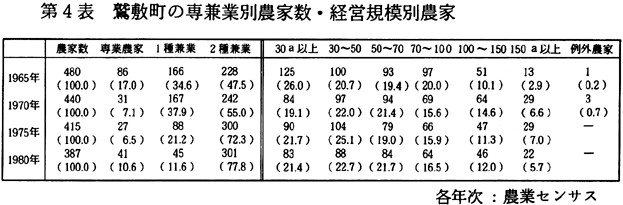 表4によると、1980年の総農家数は387戸である。専業・兼業農家の比率は専業農家10.6%(41戸)、一種兼業農家11.6%(45戸)、二種兼業農家77.8%(301戸)となっている。専業農家に一種兼業農家を加えても農業比重の高い農家は農家総数に対して22.2%と顕著に低いものである。1965年と、1980年との比較でみると、専業農家、一種兼業農家、二種兼業農家それぞれの比率は17.0%→10.6%、34.6%→11.6%、47.5%→77.8%となって、一種兼業農家がもっとも著しい減少を示し、二種兼業農家が増大して二種兼業化の比重がきわめて高いものとなっている。 1980年の階層別農家数をみると、30〜50a規模農家が88戸(22.7%)で首位であり、次いで、50〜70a規模農家84戸(21.7%)、30a以下規模農家の減少化が著しく、125戸から83戸へと43.6%の減少となったのをはじめとし、70〜100a規模農家で97戸から64戸へと34.0%、30〜50a規模農家で100戸から88戸へと12.0%の減少となっている。これから考えると、鷲敷町での農家の減少は30a未満階層の零細農家のの脱農家が最も著しく、次いで、中規模農家ともいえる70〜100a階層での農家数の脱農家が目立つようである。一方、150a以上規模農家は、1965年の13戸から、1980年に22戸と69.2%の増加となって、これらの農家が鷲敷農業の中核となっている。 以上のようなことが鷲敷農業の実態である。 |