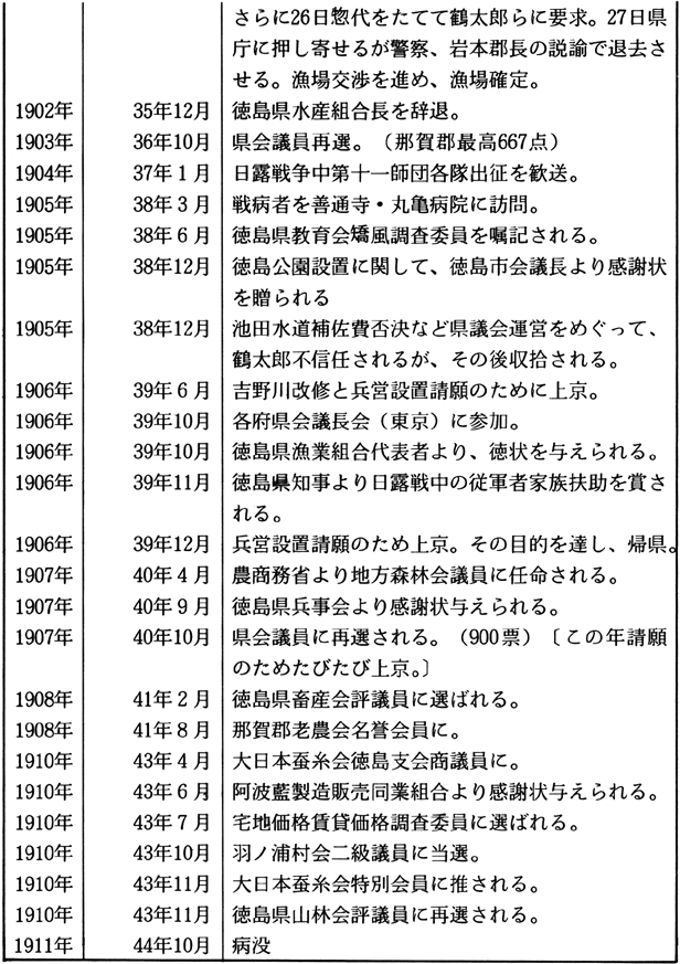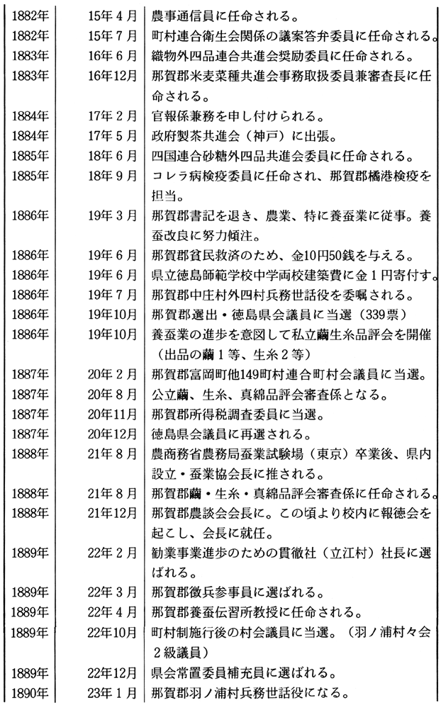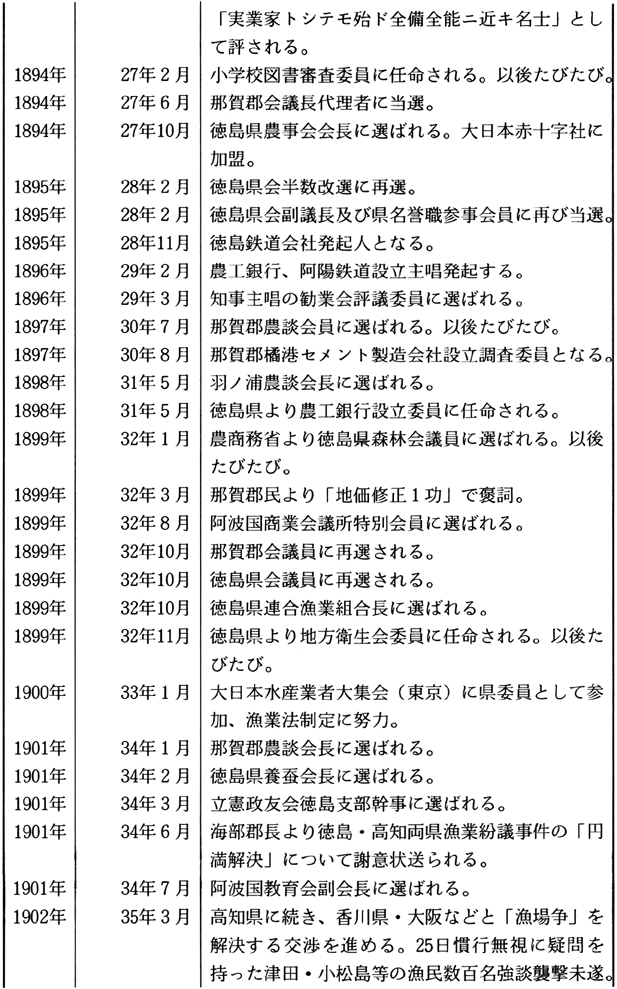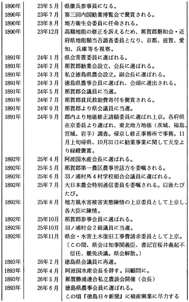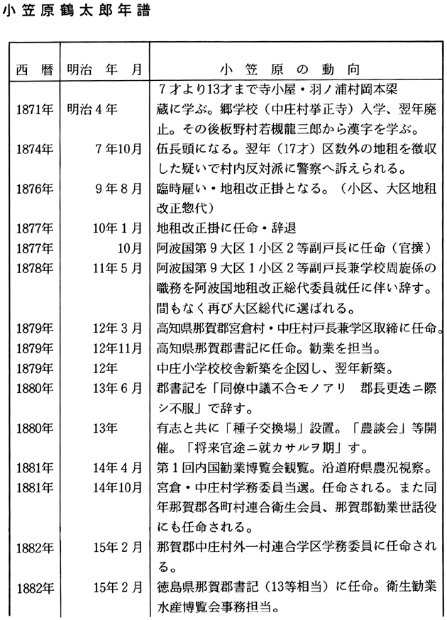 1.勧業活動への取り組み 小笠原鶴太郎は、1858(安政5)年に那賀郡宮倉村に生まれ、16歳で伍長頭、18歳で地租改正惣代、19歳で副戸長、21歳で戸長兼学区取締また同時に那賀郡書記に任命され新政府の役人として活躍をはじめた。 ここに鶴太郎の役人としての出発がはじまったが、翌明治13(1880)年には郡書記を「同僚中議不合モノアリ、郡長更迭ニ際シ不服」で辞したことが、人生の転機となり、他方で地域産業の育成活動に本格的にのりだし、近代技術摂取・生産向上への意欲を示しはじめることになった。 「農談会」「種子交換場」は明治13(1880)年、「農事モ又改良進歩ノ必要ナルヲ感シ」「植物試験」などの目的で地域の有志とともに設置し、一方翌明治14(1881)年の第1回内国勧業博覧会を観覧し各地の農業を視察して回るなどいちはやく精力的な勧業活動に取り組んだことに注目しておきたい。のち鶴太郎は農工銀行、阿陽鉄道設立発起などに関わるのも、このような活動への取り組みと関わっていると思われる。 2.県会での活動 運動史という、いわゆる自由民権運動期の鶴太郎の軌跡はどうだったか。 先述した精力的な勧業活動はその後も、明治16(1883)年に織物外四品連合共進会奨励委員、那賀郡来麦菜種共進会事務取扱委員兼審査長に任命、明治18(1885)年に四国連合砂糖外四品共進会委員に任命とさらに情熱的に取り組んでいった。加えて発展への飛躍が問われた養蚕業に集中的に取り組み「私立繭生系品評会」を開催し、また明治21(1888)年農商務省農務局蚕業試験場への遊学、帰県後の有志による「蚕業協会長」として活躍したことは本県養蚕発達史のうえでも重要な役割りを果たしたことが特に注目される。 ところで、鶴太郎はこの期に勧業活動のみならずその政治行動にその主要な活躍の場を拓きつつあった。それは明治18(1885)年を境に那賀郡書記を退き政府の権威に連らなる役人を辞職、県会議員、連合町村会議員という議会活動への志向を強めていったことである。 このことと県南で勢力を増大した徳島立憲改進党などの諸政党運動との関わりを示す史料が末見であるので何ともいえないが、実証的な解明が課題である。 さて鶴太郎が県会議員としての活躍をはじめてからの行動のなかで特に注目できるのは一貫して高額地価修正の運動に精力的に取り組んでいることである。この運動の性格は必ずしも地域民衆生活に根ざしたものといえるものではないが、その運動が地域民衆の多様な願いやそれを実現する動向とどう関わっていたのかといった関心を重ねながら以下その運動を中心に紹介しておこう。 3.地価修正運動について さて、地価修正運動とはいうまでもなく明治初年の地租改正によって決められた課税基準の修正を求める運動をさすのだが、その運動は地租改正実施時期からたびたび取り組まれた。実際、地租改正法体系自体が、その実施時期の地域的相違ともあいまって極めて重大な予盾を孕むものだったのであり、それに対して担税者・農民はたびたびその根幹である地価修正を求めてきた。それゆえ明治政府もやむなく明治13年、20年と手直し、修正をせざるをえなかったが、それは部分的な修正に過ぎなかった。しかし、明治22年のそれは初期議会以後の全国的な地価修正運動のモデルになったとされるように地租軽減に本格的に取り組まざるをえないものであった。 そのようなわけで、本報告ではこのような動きを背景にその後の鶴太郎の動きをとおして徳島県における運動がどう展開し、先述したようにそれは地域民衆とどう関わっていたのかという課題に焦点をあて紹介したい。 まず、鶴太郎は明治23(1890)年には「本縣地租ノ高額ナルヲ以テ政府ニ訴エ」るために有志者設立の「那賀郡懇和会」の近府県地租額当否調査委員となって広島、山口、岡山、兵庫、さらに京都、滋賀、愛知、兵庫などを二度にわたって視察する。また続いて翌24(1891)年郡内より地価修正請願委員に選出され上京しさらに、「各府県上京委員ヨリ撰バレ東北地方地価ノ実際調査ノ為メ」茨城、福島、宮城、岩手の調査を行いさらに東京の修正事務所で活動を行った。 さて、このような鶴太郎の努力にも拘らず徳島県における地価修正も全国的に明治31(1898)年に実施される田畑地価特別修正をまたなければならず、すでに地租が国家財源として相対的に地位を低下し補助的な税の役割に転落して以降ではある。しかし、初期議会期は同時に地域民衆生活にとっては最も切実に地租軽減が必要とされた時期であり、このような観点からもこの期の地価修正運動の実態を一層深く追究する必要があろうし、さらには、この期にたびたびくり返された地租「上納延期」の請願や「荒地免租」要求などの地域民衆生活に根ざす動向との関わりを問題にしながら。 4.水害土木復旧工事費請求運動について ところで、鶴太郎らが地価修正運動に取り組んだ頃には同時に吉野川などの風水害がたびたびひき起こされその対応を鋭く問われた。
