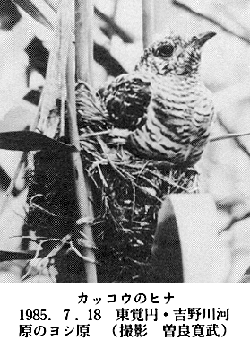 カッコウの繁殖確認 カッコウ(ホトトギス科)は夏鳥として渡来し、県下では山地の疎林・草原に生息する。他種の鳥の巣に卵を産み込んでヒナを育てさせる「托卵性」をもつ。 1985年7月4日、六條大橋南詰西方のヨシ原において、本種のヒナがオオヨシキリの巣内で発見された。徳島県初の繁殖確認記録である。また、平地における繁殖は西日本では珍しく、極めて貴重である。第十のセキから江川と吉野川の合流点付近にかけてのヨシ原や原野では、5〜8月にさえずる成鳥の姿がよく観察されたので、他にも繁殖地があるのは確実である。