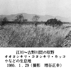 コヨシキリ 吉野川と江川(吉野川河川敷内)にはさまれた地域は、ヨシや他の高茎草本群落が拡がりその中にヤナギなどの樹木が点在するいわゆる原野状の環境である。ここは繁殖期にはオオヨシキリが数多く生息・繁殖し、カッコウも生息する。 さらに、コヨシキリが6月10日〜7月4日に2羽さえずっているのが確認された。本種は、主として本州中部以北の高原、北海道の草原で繁殖する。西日本では繁殖せず旅鳥として通過して行くとされている。(最近九州で繁殖確認された)オオヨシキリより乾いた草原を好む。徳島県で初めて繁殖期を通して観察されたこにより、繁殖の可能性が高まってきた。もし正式に繁殖確認されれば、従来の通説を覆す全国的な一大事件となろう。