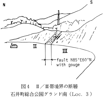 の断層の西方延長は、25万分の1地形図に見られるケルンコルを形成しており、寺戸によれば鴨島町長谷付近に湧水を伴う破砕帯として出現する。 II/III帯境界の断層:石井町内谷光蔵寺北東(Loc.2)では、幅約10cmの2つの破砕帯を伴う走向N70°E、傾斜65°Nの断層を挟んでII帯の黒色片岩とIII帯の緑色片岩が接する。 石井町前山総合公園のグランド南(Loc.3)には、黒色片岩の破砕による幅5mのグージを伴う走向N85°E傾斜60°Nの断層を挟んでII帯の黒色片岩とIII帯の緑色片岩および黒色片岩が接する(図4)。また断層には、淡緑色の滑石より成るグージも見られ、超塩基性岩体の破砕によるものと考えられる。