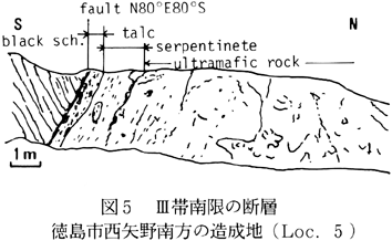神山町長谷北方の道路沿い(Loc.4)では幅1mのグージを伴う走向N65°E傾斜85°Nの断層を挟んでII帯の黒色片岩とIII帯の緑色片岩が接する。 III帯南限の断層:徳島市西矢野南方の造成地(Loc.5)では、幅15mの超塩基性岩体の南縁に幅0.5mの破砕帯を伴う走向N80°E、傾斜80°Sの断層が見られる(図5)。断層の南側には黒色片岩が分布する。断層に接する超塩基性岩体は幅1.5mにわたって滑石および、ブロック化した蛇紋岩となっている。