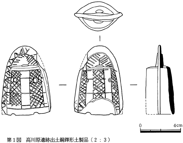 銅鐸形土製品の形状 高さ6.97cm、底部付近の長径4.82cm、中央部での短径2.78cmを測る。細いヘラ先により施文されておりA面とB面とは、斜格子による縦帯の位置に相違がみられる。これは、A面において鰭を飾る鋸歯文が身の部分にはみ出したため斜格子文が一つずれた結果によるものと考えられる。また通常の銅鐸は、鈕の外縁から鰭にかけての鋸歯文が内側を向くが、外向きに施文されていること、一段目に穿たれる型持孔が二段目上部に位置すること、斜格子による横帯が一条の沈線に省略されていることなど銅鐸における約束ごとが十分守られているとはいえない。しかしながら、現在西日本各地で発見されている50例近い土製品の中で、高川原例は最も銅鐸を忠実に模倣していることには違いない。