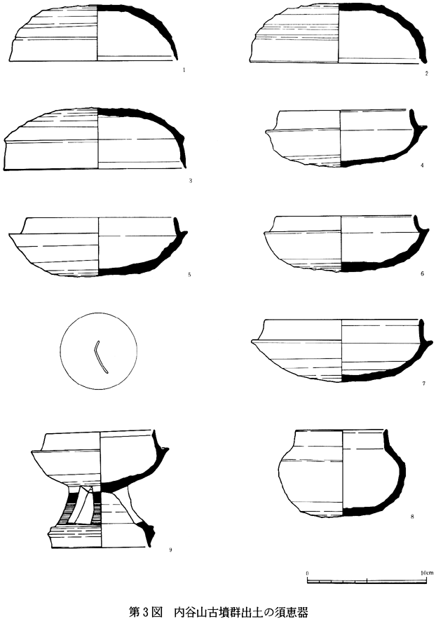 II 内谷山古墳群出土の須恵器 高川原公民館に展示されている須恵器のうち、徳島県名西郡石井町内谷に所在する、内谷山古墳群より出土した須恵器をこの項で報告する。この古墳群は、気延山の北東にのびる尾根上に造営されており、現在は開墾が進み、各古墳の旧状が失われている。付近には、尼寺古墳群、ひびき岩古墳群があり、そのうち尼寺1、2号墳(1)とひびき岩17号墳(2)は、6世紀後半と報告されている。今回報告する須恵器は、内谷山古墳群より出土したとされてはいるが、古墳群のうちのどの古墳より出土したものかは不明である。