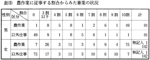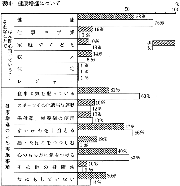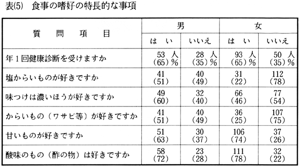 身近なことで一ばん関心を持っている点では男・女とも「健康」で健康への気配りがうかがわれる。健康増進のための実施事項は、男・女とも食事に気を配る。ついで、すいみんを十分とる。心の持ち方に気をつけるとなっている。 年1回の受診は男・女とも65%である。 食事嗜好は男性が塩からいものや味つけの濃いものを好む率が高く、女性は甘いものや酸味を好む。 これらの結果は、高血圧や肥満につながるもので、成人病との関連が心配される。 働く農民、とくに中年以後の農民に多発する「症候群」の8項目の調査では表(6)に示したように男・女ともに「肩こり」と「腰痛」の訴えが高く、さらに「夜間頻尿」と「手足のしびれ」と続いている。