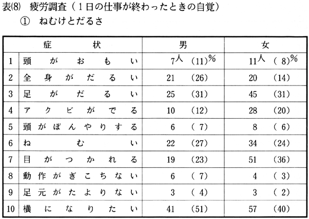 総合点が2点以下で対策を必要としない人が、男で46%、女で42%、なんらかの対策を必要とする人は男・女とも48%である。 さらに高度の対策治療を必要とする人が男6%、女10%で女性が多く、こうした疲れの積み重ねが慢性疲労となって病気の始まりの危険サインと考えなければならない。 1日の仕事が終わった時点での疲れを自覚する「いまの疲労度」(急性疲労)を調査した。 表(8)1