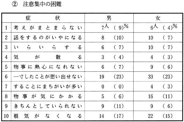 の注意集中の困難さを示す精神疲労では「一寸したことが思い出せない」「根気がなくなる」「話をするのがいやになる」等の訴えが注目される。 3