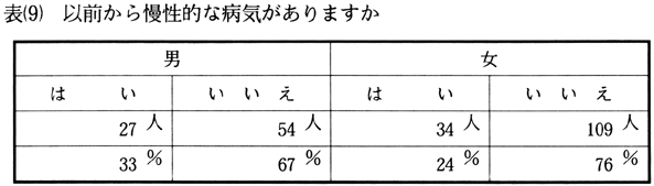 の局在した「身体違和感」つまり、神経感覚の疲れでは、「腰痛」と「肩こり」が出しており、農作業が前かがみの多い繰り返し作業が長時間続けられていることに起因しているのではないかと考えられる。 表(9)、表(10)は一般に「持病」と呼ばれている慢性的な病気について調査したものである。