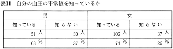 対象者は現に農業に従事している健康な人で、男33%女24%がなんらかの慢性的な病気を持っており、内容は高血圧をはじめ胃・十二指腸といわゆる成人病と呼ばれる病気が多くみうけられる。 表(11)に示した自分の血圧の正常値を知っている人は男63%女74%である。