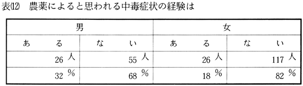 次に農薬散布とそれによる中毒についての調査結果では中毒症状の経験は男32%女18%と多く、表(13)はその症状を示している。男・女とも、皮膚のかぶれ、頭重、はき気等の症状がある。