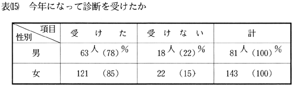 表(15)の健診の受診状況については受けた人男78%女85%であり、健康管理の第1条件である「早期発見・早期治療」のためさらに受診の呼びかけが大切である。表(16)は健診の内容である。