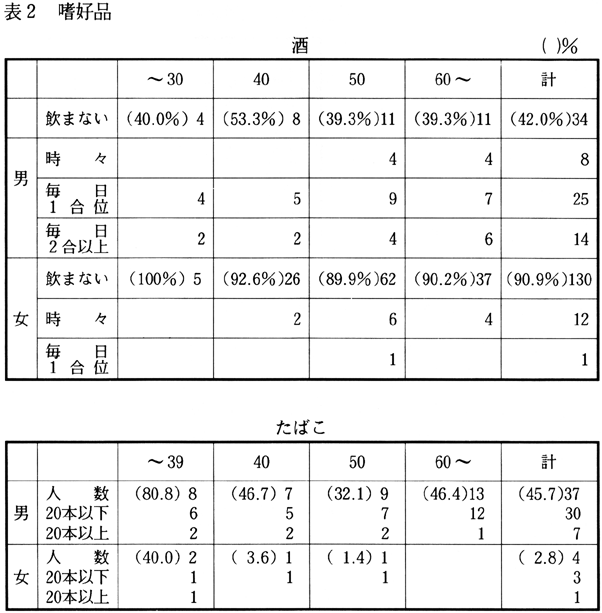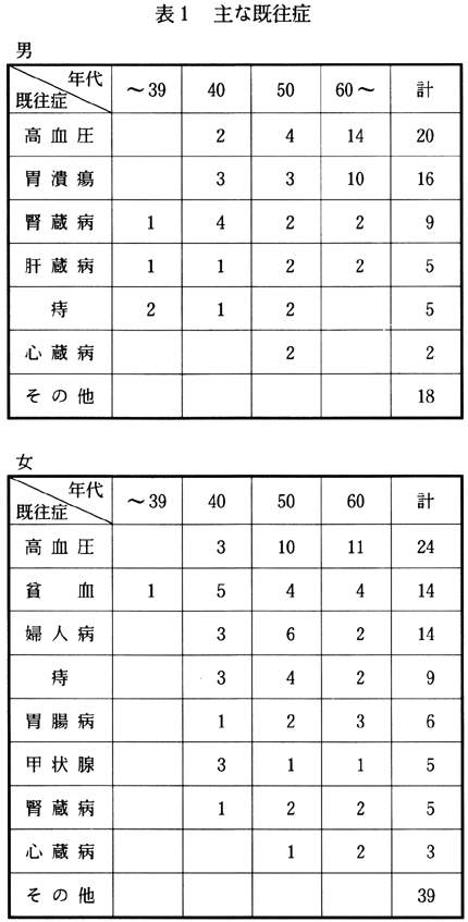 男子では、高血圧が20人(25%)と1位で胃潰瘍、腎臓病などが多くみられた。女子でも1位はやはり高血圧で24人(17%)にみられた。 つづいて貧血、婦人病、痔などが高頻度にみられた。ただし、高血圧者のうち調査時点で実際に投薬治療を受けていたものは男子1人、女子3人ときわめて少数であった。また既応症のうち心疾患が男子2人、女子3人と受診者層の年令が高いにもかかわらず非常に少ないことが逆に注目された。 嗜好の調査を酒とたばこについて行った。
