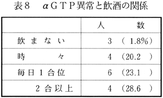 GOT、GPTの上昇はほとんどが100未満と軽微であり1人のみがGOT169、GPT128とやや高く、同時にr−GTPも310と上昇しており、これはアルコール性肝障害と考えられた。これらトランスアミナーゼの上昇と他の因子すなわちコレステロール、コリンエステラーゼ、肥満度などと考え合せると19人がアルコール性肝障害を含む脂肪肝が疑われた。他にHBVキャリヤー(肝機能的には正常)が3人、その他の肝障害が3人、農薬中毒と関連があると思われる低コリンエステラーゼ血症が4人にみられた。r−GTPについては、飲酒習慣との関連につき検討し表8に示した。