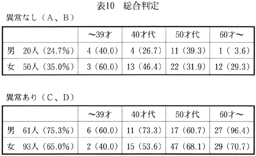 総合判定で異常ありとしたものが男子61人(75.3%)、女子93人(65.0%)と高頻度にみられた。これは受診者の構成年令層の変化、検索項目の多様性、検査判定の厳密性などとの関連もありただちに病気とは結びつけ難い。ただしこれらの群については積極的に精査を行い追跡調査を行う必要がある。 3
