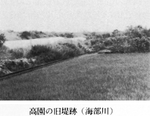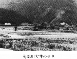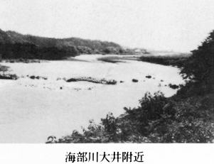 海部川は、徳島県と高知県の県境になる貧田丸1018.9mと、海部郡川上村湯桶の丸に源を発し、植小屋谷となって東南に2里流れ、大比の西で右岸の支流を入れて、東北方向へ2里半流下して皆(かい)の瀬(せ)に達する。これより南に流路を変えて左岸の小川谷を合せ、12町程で桑原谷と合流し、更に12町流れて玉笠谷を合せ、約1里下って川上村神野附近で柿谷を加え、更に約1里流れて相川と合流している。往昔は下若松で東南に山裾に沿って流れ、西に曲って相川と合流していた。 相川から南流して15町程で笹無谷と合流し、10町余を西流して南に流路をとり、約20町流下して川東村吉野附近で東南に向きを変えている。古くは、吉野附近で東の山裾に沿い、南に曲り、川西村高園附近を流れて母川に合流する流路と、現在の流路とに分れていた。300年程前に現在の流路が安定したものである。 この流れは吉野附近で東南に曲り、約28町流れて、川西村高園で櫛川谷川とその他の谷川や、西敷川中山の槇山川が合流して母川となり、脇の宮附近で海部川に合流し、約25町で奥浦に至る。ここから城山の南を迂回し、鞆浦北で海に向って開口していたが、幕末に現在の流路に人為的に作り変えた。 流程9里20町、約36.31km、舟航の見込める水路は7里16町、約29.17km、流筏可能の航路8里15町、ほぼ32.27km、主として10〜30石舟が就航し、川筋の高瀬舟は300隻で、1集落当りでは3〜5隻所有していた。舟付場としては、皆ノ瀬・小川口・桑原・樫ノ瀬・神野・相川口・大井・吉野・奥浦などが、それぞれあげられる。 舟付場には宿屋や商店が並び、下りの積荷としては木炭・薪炭・木材・草木灰などがあり、上りには日常雑貨・塩・酒・殻類などがあった。渡し場は、舟付場に設けられていたものである。 筏流しは、「一番はな」は木材の直径5〜6寸を、10本並列し、スズメ■を打ち、二番やりは径7〜8寸で、8本を筏の一番と二番との間を縄でつなぎ、3寸離して結ぶ。三番やり径8寸を、6〜7本、4番やりは径1尺を5〜6本、5番やりになると、径1尺1寸を4〜5本で一つの筏に組んで、2〜3名乗る。1番やりと2番やりの時は1人で乗って川を下る。 筏元が6名程いて、水量など時期を見て流し、一たん吉野で木を留め、更に脇之宮・奥浦へ流していた。脇の宮には木材の検査所があって、大和という人が検査にあたっていたが、後に森林太郎にかわった。 阿波藩の藩政時代には、奥浦に舟代官所があって、高瀬舟の積荷の木材や木灰に、それぞれ賦一金を徴収していた。 海部川の堤防としては、藩政時代に構築されたものが川東村吉野に残って、今は国道193号線の一部に利用され、芝・高園から下流は、現在の堤防の両側に昔のものが残っている。他の堤防は大正年代に芯(しん)に石積みし、その上に土盛りして築かれ、逐次補修されて現在の形になっている。 高瀬舟の航行は、道路ができて昭和初期にはなくなり、筏流しも昭和25年頃に見られなくなった。海部川の舟運は、昭和初年まで引き舟人夫30名が、下高園や脇の宮に居住していた。筏流しは昭和10年頃まで、大井が揚場で貯蔵し、奥浦城山へ逐次流していたという。 海部川の洪水の記録としては、正保4年8月(1647)、海部城北麓屋敷流失各地に被害ありというのを始め、寛文2年8月13日洪水、寛文4年9月1日洪水、延宝4年9月2日洪水、姫・能山・吉野・高園村で1畝12歩の田畑流失、21名死亡、牛馬30頭、家屋流失多数とある。 元禄4年8月7日洪水、高園村田畑藍作地地等7畝24歩流失、享保11年11月13日洪水、高園村柱の北中下田1畝6歩、下田1畝、下三田2畝24歩、中田6畝12歩、下三田7畝12歩、中下田9畝、下田3畝9歩の農作物流失とある。続いて享保14年洪水、享保16年8月17日洪水、元文3年8月11日洪水、高園村村道善寺川沿い藍畑2畝24歩。けい前8畝19歩流失。元文4年9月7日洪水、元文5年7月24日洪水、寛保元年8月31日洪水などとある。 延享3年10月8日洪水、沿岸各地の被害多数。寛延2年7月2日洪水、薪用材4,000石流失。宝暦4年10月14日洪水、吉野村3名、大井村1名、芝1名、高園2名の死者。牛馬30頭と田畑流失し、10か村で被害ありと記録されている。 明和6年9月8日洪水、明和8年8月15日洪水、安永3年10月5日洪水、寛政10年5月16日洪水、文化10年8月芝用水完成。天保2年9月10日洪水、弘化4年8月20日洪水、川東村に被害あり。嘉永2年8月27日洪水、嘉永3年8月2日洪水、安政2年9月30日洪水、万延元年8月27日と11月16日に洪水、慶応2年9月1日洪水などとある。詳細な被害状況の記録は残っていない。 明治期に入ると、明治5年7月15日洪水、明治10年9月2日洪水、明治11年9月3日洪水、明治25年7月23日洪水、平井村保勢山崩壊、いわゆる保勢切れで死者45名、家畜多数家屋流失、下流の被害夥(おびただ)しと記録されている。引続いて、明治26年8月10日にも洪水があった。 大正期には、大正元年9月22日洪水、大正4年9月9日洪水、大正7年11月12日洪水、大正9年8月30日洪水などとある。何れも、洪水は熱帯低気圧の襲来の時期に集中しており、風による被害も多かっ
