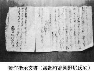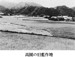 藍の栽培 寛政12年4月12日付、藍方代官から海部高園の組頭庄屋野尻本蔵宛ての書状から、野江・高園・芝・中山・櫛川で藍作が、100余名によって10数町歩ほど栽培されたことを知る事ができる。 明治年代まで栽培され、地元の紺屋や、日和佐の谷兵吉、富岡の吹田栄蔵・板東次平、椿の武田次三郎、木岐の浜名万喜太郎等に買取られ、大正年代になると藍作も減り、富岡の藍商に売り渡すのみとなった。大正の始めから藍作は養蚕にとって変り、藍作地は次第に桑園となった。中山地区だけは薬用として最近までつくっていた。