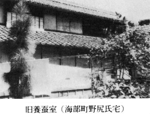 養蚕 養蚕は歴史が古く、海部の都か高園にあった時代からで、高園で40戸が行い、昭和10年頃まで谷本や野村荘次郎が続けていた。野尻・河田では、明治から昭和19年までダルマ式で絹糸の採取を、野江では20戸が昭和15年頃まで養蚕を行ったが、ダルマ式の絹糸採りは1戸だった。芝で30戸が昭和15年頃まで、中山で23戸が昭和3年頃まで、櫛川では30戸、ダルマ式絹糸繰りは10戸が操業していた。 吉田では3戸が養蚕、ダルマ式糸採りは3戸が、何れも昭和15年頃まで。富田では113戸が養蚕、ダルマ式絹糸採りは10戸が行っていた。脇ノ宮では30戸、奥浦では100戸がそれぞれ昭和5年頃まで。鞆浦では11戸がダルマ式絹糸採りを、高橋柱が明治始めから昭和19年頃まで行っていた。 奥浦の広田才智郎は、昭和13年頃まで、川西村や那賀郡・高知県から繭を買入れて製糸業を行っていた。このほか、川上・名村・山本・大津・山名・里の6戸は、女工を使ってダルマ式で絹糸採りを、大正8年から昭和33年頃まで操業していた。宍戸キクや、那村相昭治も操業していた。以上のように古く各地で養蚕や絹糸の製屋が行われていたが、今は樫小屋で行っているだけである。