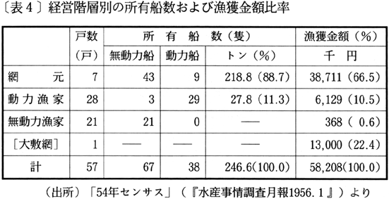 家一族は、サバ巾着網1、イワシ揚繰網1、ブリ建網5、目白建網2、サバ建網3などの漁具を所有しており、他の網元もほぼ同様に多種にわたる漁具を所有していた。(4)こうした漁業手段の網元への集中は、敗戦後10年を経た昭和30年代初頭になってもそれほど変化はなかった。〔表4〕では、7網元が動力船トン数の88.7%をおさえ、それにともない漁獲金高の66.5%を集中していることを示しているが、そこからは網元が戦後のこの段階でも依然として支配的地位を保持していたことが読みとれよう。