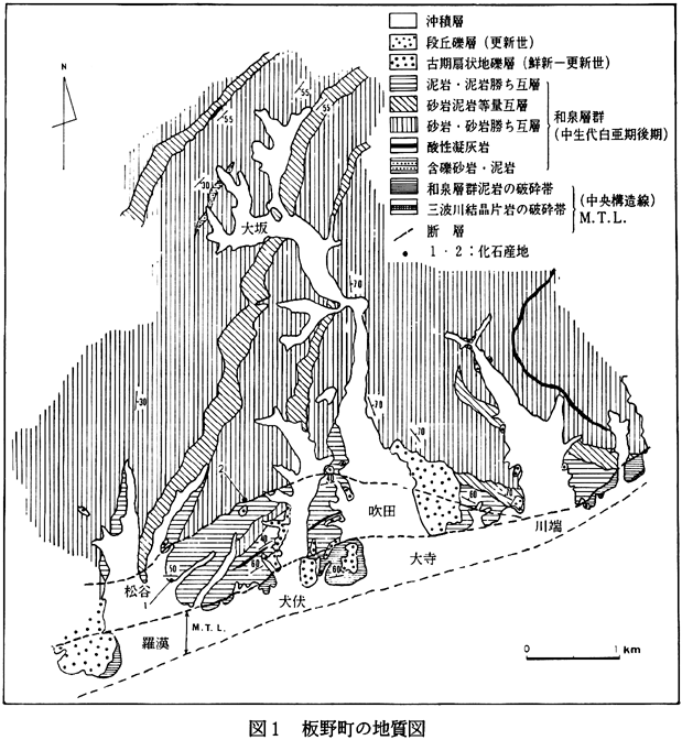 1.はじめに 板野町の地質は、阿讃山脈に分布する和泉層群とその南麓に点在する古期扇状地礫層(土柱礫層相当層)、平野部の沖積層に分けられる。また、山地と平野の境には、中央構造線が位置する(図1)。