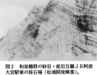 2.和泉層群 和泉層群は、大阪府と和歌山県境の和泉山脈に模式的にみられる白亜紀後期(今から約8千万年前)の海成層であり、西南日本内帯の南縁(中央構造線の北側)に沿って分布しており、四国東部では阿讃山脈がその分布地帯にあたる。本層群は、主として砂岩・泥岩互層から成り、泥岩、アルコーズ砂岩、含礫泥岩および酸性凝灰岩を伴う。また、地質構造は、東に開いた向斜構造であり、地層は西から東へと順次新しくなっている(須鎗、1973)。 砂岩・泥岩互層を砂岩の割合から、砂勝ち互層、砂岩・泥岩等量互層、泥岩勝ち互層に分けてみると、町内では山脈の中軸部は砂勝ち互層が多く、南麓には泥勝ち互層が多い(図1)。JR阿波大宮駅東の採石場では、典型的な砂岩・泥岩互層が見られる(図2)。