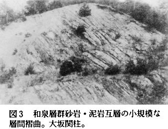 この砂岩・泥岩互層は、下部が単層の厚さ数10cm−1mの砂岩勝ち互層に始まり砂岩・泥岩等量互層を経て泥岩勝ち互層および泥岩に終わる数m〜10数mのサイクルを有する。砂岩単層の内部は級化成層を成しており、下部には、細かな礫を伴なうことがある。また、砂岩層の下底面には、フルートキャスト(流痕)、グルーブキャスト(引きずり痕)、荷重痕(変形痕)が発達している。このような地層をフリッシュ相といい、砂〜泥の砕屑粒子が多量に海水と混濁して密度が高くなった流体(乱泥流)が海底斜面を重力により流れ下った結果できた堆積物と考えられている。また、所により、砂岩・泥岩互層間の厚さ数m〜数10mの地層が大きく褶曲している部分がある(図3)。