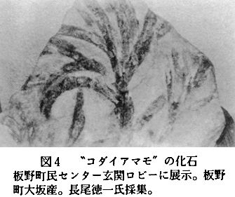 これは現生のアマモ(Zostera)と形態が似ていることからArchaeozosteta(古代アマモ)と名づけられたが、最近では、底棲生物の這い跡とする説も出ている。その理由として、植物としての組織が保存された例が知られていないこと、乱泥流砂岩上面付近の泥質部との境界面上に特徴的に産するにもかかわらず、いずれも形態がきわめてよく保存されており、葉状部が折れたり、曲がったり、ちぎれたりした痕跡がないこと、同時代の地層から、形態が極めて類似した生痕化石が見つかっていることなどがあげられる。 3.古期扇状地礫層 阿波町土柱には、主として礫岩から成る地層があり、特に粘土や砂が固結した部分は浸食に耐え、その結果「土柱」(悪地地形)をつくっているが、板野町内でもこのような地形をつくる礫岩層が見られる。これらは、主に阿讃山脈の隆起によってもたらされた扇状地性の堆積物である。これらは、板野町内では沖積層におおわれることが多いが、羅漢西の上板町滝ノ宮や犬伏、吹田、川端などに見られる。分布地域の海抜高度は25m〜70mの範囲に及んでおり、当地域の層厚は50mを越えるとみられる。 滝ノ宮では、礫やそれを固結する砂も赤色化している。これは、現在より温暖な時期に風化を受けた結果、砂礫中に含まれている鉄分が空中酸化を受けて酸化第二鉄を生じたことによる。礫の中心部まで風化が進んでおり、スコップで抵抗なく削ることができるクサリ礫である。犬伏の諏訪神社西や大寺の亀山神社の道路沿いにも同様の礫層が見られる。これらの礫は、全体として滝の宮の礫ほど風化を受けていないが、完全なクサリ礫となったもの、クサリ礫だが脱色しているものが混じっており、円礫にクサリ礫が多い。岡ノ宮の韓崇山の海抜60m付近に礫層が見られる(図5)。