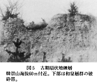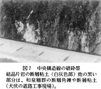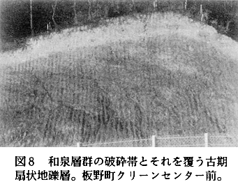和泉層群の破砕帯が黒っぽいのに対して結晶片岩の破砕帯は鮮かな灰白〜淡緑灰色をしている場合が多いので区別しやすい。 古期扇状地礫層と中央構造線との関係を見ると破砕帯を古期扇状地礫層が不整合に覆っており、礫層はほとんど変位を受けていない(図8)。このことは、阿讃山脈の和泉層群が中央構造線の断層運動による著しい破砕を受けた後、古期扇状地礫層が堆積したことを物語っている。
