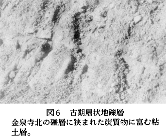 ここでは、礫層の基底が和泉層群の破砕帯を不整合に覆っている。吹田の奥宮神社や奥原の放牧場沿いの道路にも亀山神社でみられるような礫層があり、表土に厚く覆われているが、この地域のなだらかな斜面下全体に古期扇状地礫層が分布していると考えられる。金泉寺北の露頭では、破砕をうけた和泉層群を不整合に覆って礫層のほか、厚さ10〜30cmの炭質物に富んだ粘土層があり、炭化した植物片が多数採集できた(図6)。