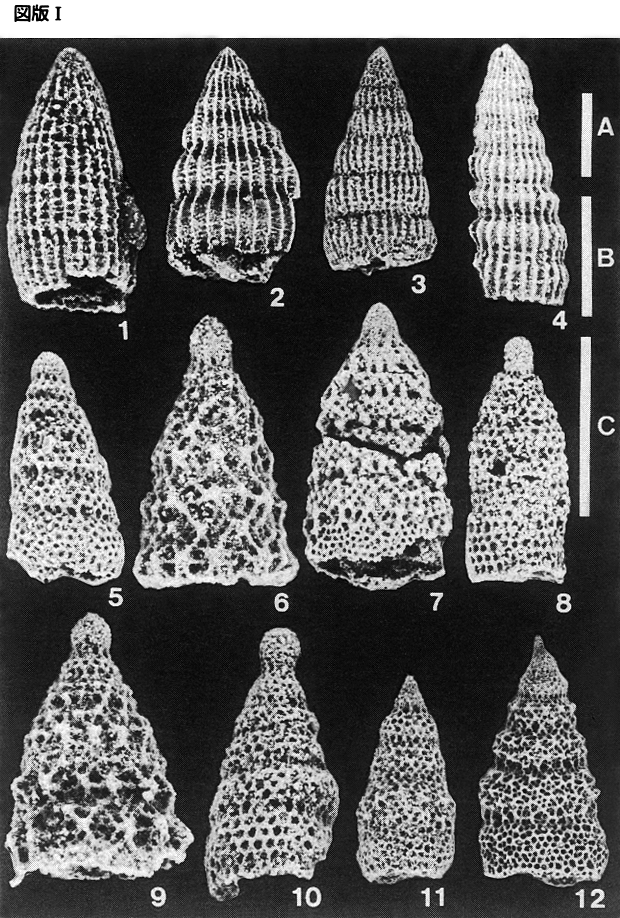5.まとめ 板野町内の阿讃山脈の和泉層群、古期扇状地礫層、中央構造線について調査した。その結果は以下に要約される。 (1)和泉層群の岩相区分を行った。また板野町内から初めて放散虫化石が検出され、これによる地質年代は白亜紀後期(カンパニアン後期)と推定した。 (2)板野町地域の古期扇状地礫層の分布が明らかになった。 (3)中央構造線に伴う結晶片岩の破砕帯が本町でも見られた。中央構造線は古期扇状地礫層に対して、ほとんど変位を与えていない。 文献 阿子島・須鎗和巳、1986、中央構造線吉野川地溝の形成期、日本地質学会第93年学術大会演旨、p.129. 須鎗和巳、1973、阿讃山脈和泉層群の岩相区分と対比 東北大学理科報告(地質)、特別号、no.6、489−495. 須鎗和巳・橋本寿夫、1985、四国東部の和泉層群より産した放散虫群集・徳島大教養紀要(自然)、15、103−127. 須鎗和巳、1987、徳島県中央構造線に関する新知見、地質学会関西支部報 no.104、西日本支部報 no.88、合併号、6−7. 坂東祐司・橋本寿夫、1984、阿讃山地における和泉層群産アンモナイト化石とその生層序、香川大教育研報(II)、34、11−39. 水野清秀、1987、四国及び淡路島の中央構造線沿いに分布する鮮新・更新統について(予報).地調月報、38、15−20. 山崎哲司、1987、四国・淡路島西部の和泉層群の放散虫群集、地質学雑誌、93、6、403−417. 図版I すべてLoc.1より産出した放散虫。